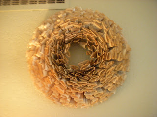 It's amazing, I must say. I originally saw this wreath on the Quilted Fish blog spot, which then linked me to another site with directions on how to make this beatuty myself. While a book did need to be destroyed, it lended itself to a beautiful piece of art that hangs nicely above my bookshelf, and bring character to my living room.